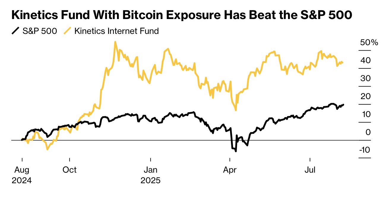 以Kinetics Internet Fund(代码)为例,数据显示,这只基金过去一年大幅跑赢其基准指数(标普500指数)23个百分点。而该产品管理的3.48亿美元资产中,约有一半都投资于两只由灰度信托基金公司推出的比特币现货ETF,与比特币相关的产品贡献了其总回报的大部分。