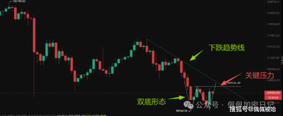 比特币再次下探10万后开始反弹,12小时级别已经出现止跌信号,而且还走出了双底形态,现在需要重点关注的压力位就是:104500美金,放量突破,并且回踩颈线缩量,那后续就是很明确:属于趋势反转。