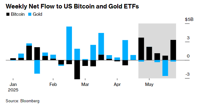 数据显示,过去五周内,以贝莱德旗下比特币ETF-iShares(IBIT)为首的美国比特币ETF累计净流入超90亿美元,同期黄金ETF却遭遇逾28亿美元资金外流。
