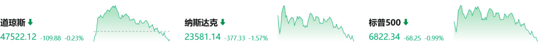 出于业绩不佳和市场对AI泡沫的担忧,多只大型科技股下跌,Meta收跌11.33%,微软跌2.9%;费城半导体指数跌1.53%,30只成分股中22家下跌。AMD跌3.59%,博通跌2.46%;英伟达跌2%,市值失守5万亿美元关口。