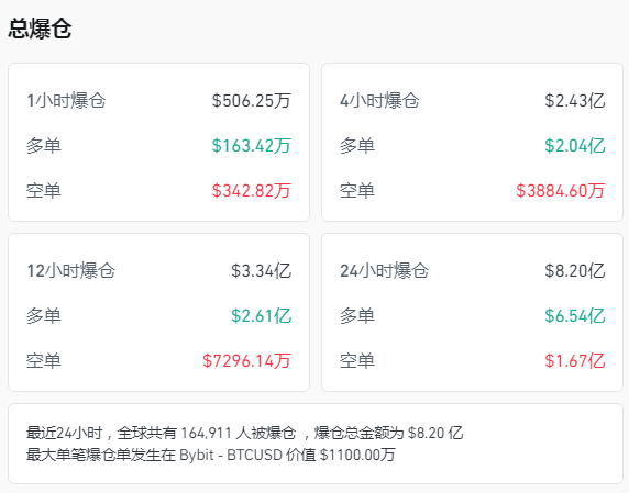 。Coinglass平台显示,最近24小时,全球共有超过16万人被爆仓,爆仓金额超过8亿美元。