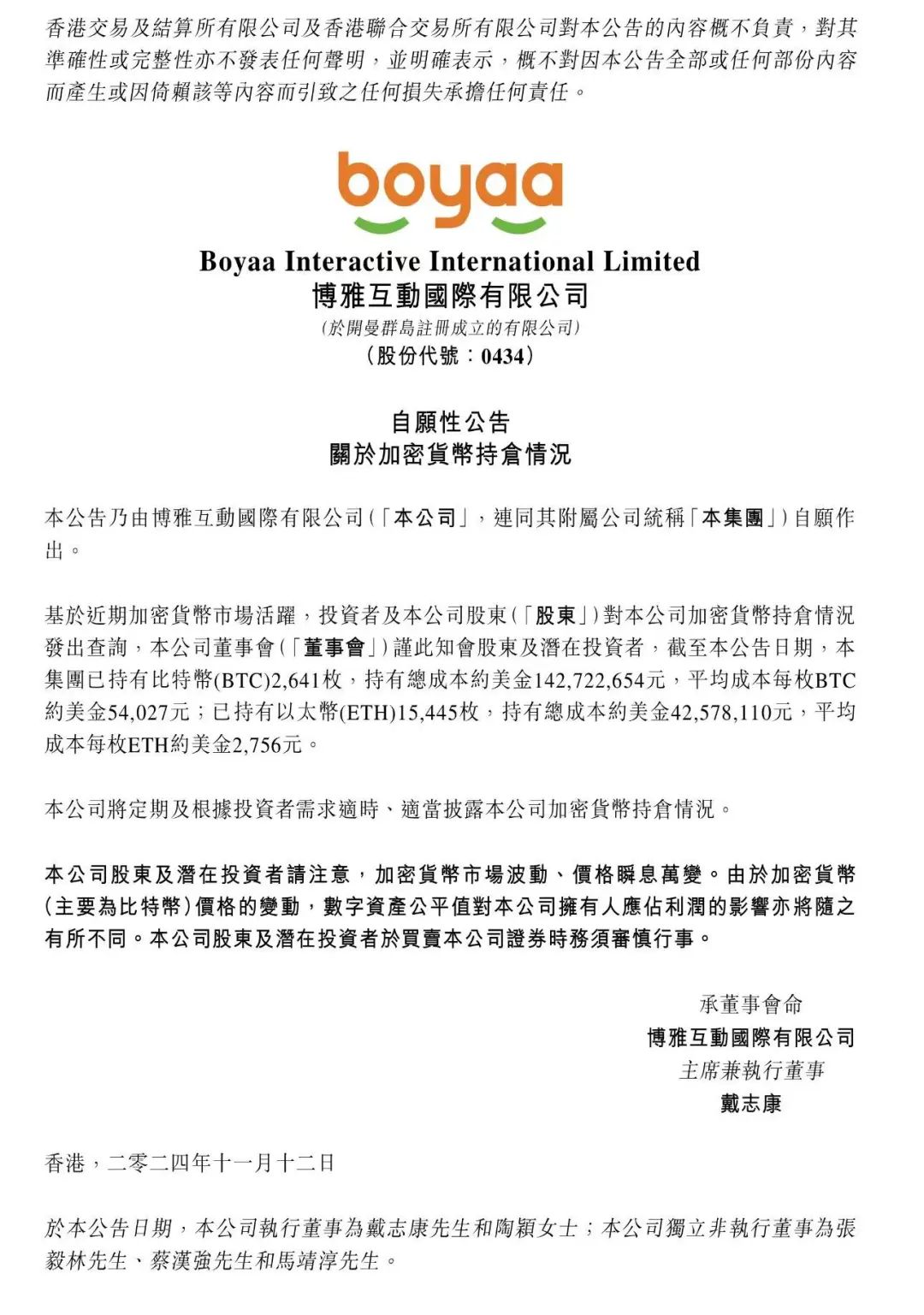 博雅互动(HK00434)11月12日晚间发布公告称,截至公告日期,公司已持有比特币2641枚,总成本约1.43亿美元,平均成本约5.4万美元/枚;已持有以太坊1.54万枚,总成本约4257.81万美元,平均成本约2756美元/枚。