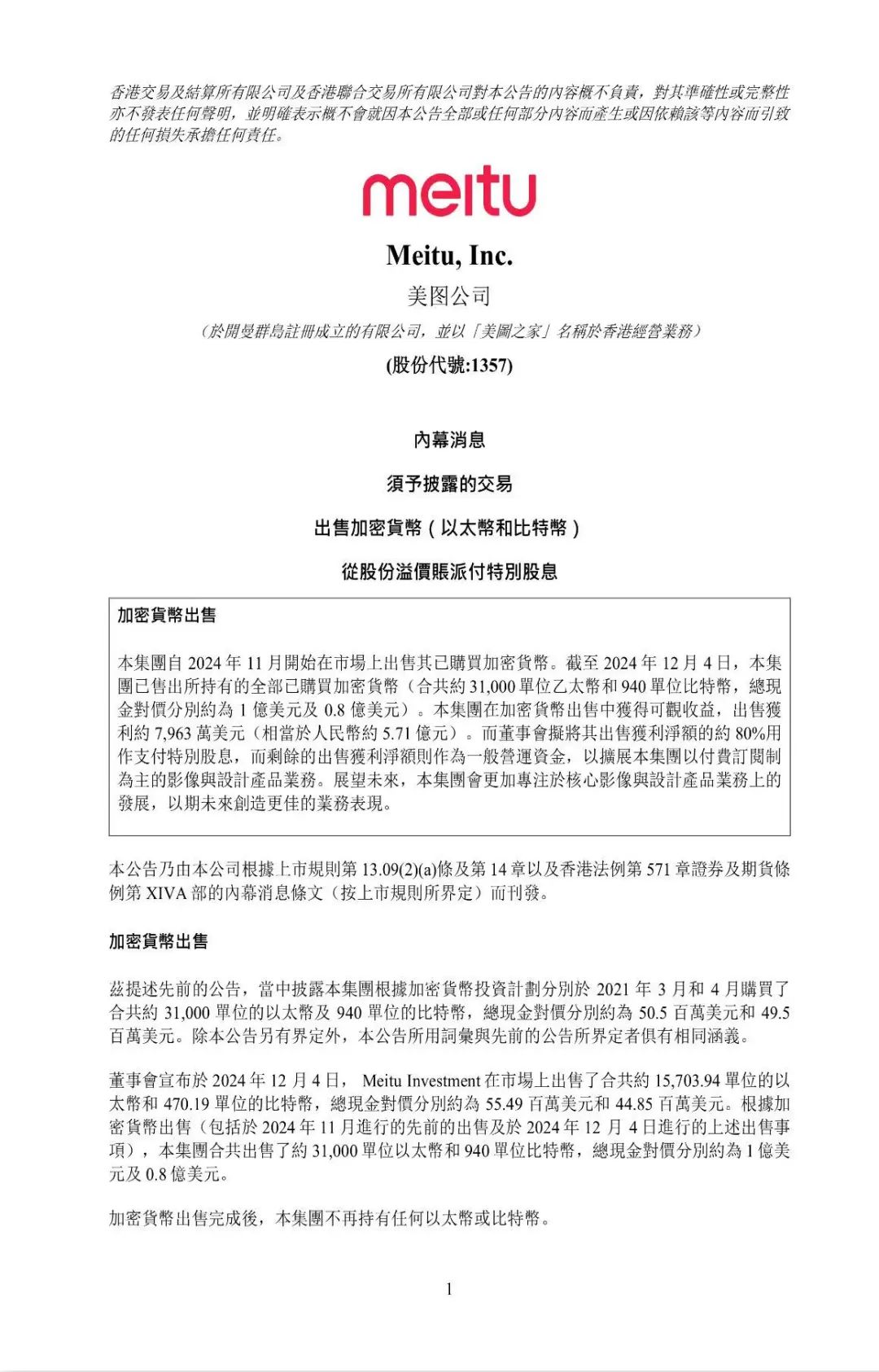 具体来看,公告显示,美图公司自2024年11月开始在市场上出售其已购买加密货币,截至12月4日,已售出所持有的全部已购买加密货币(合共约31000单位以太坊和940单位比特币,总现金对价分别约为1亿美元及0.8亿美元。