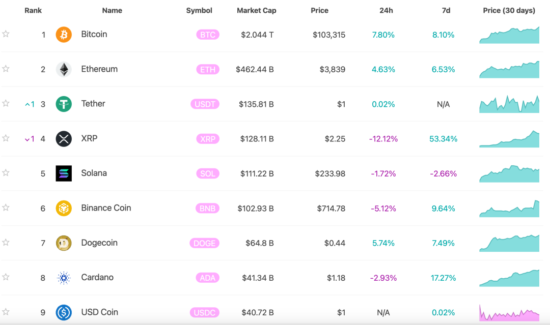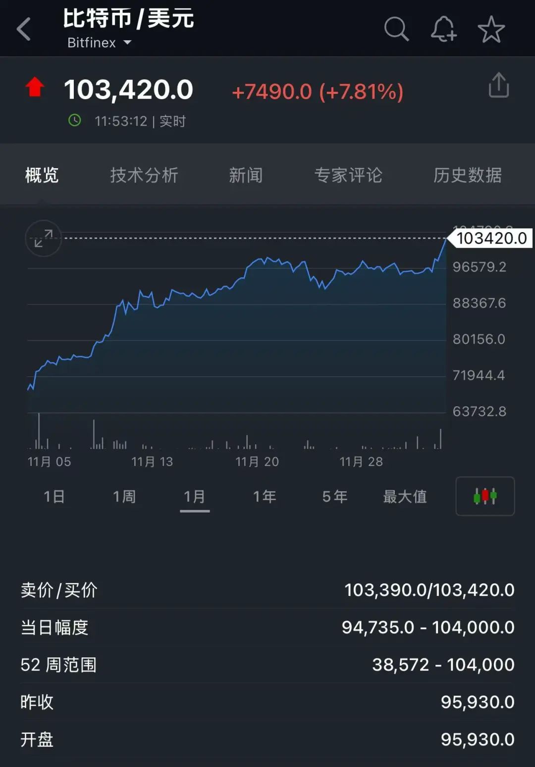 12月5日上午,比特币正式突破10万美元/枚,截至发稿,比特币报10.34万美元/枚,日内上涨7.81%,创历史新高,总市值超2万亿美元。拉长时间来看,年内比特币涨幅近140%。11月4日以来,比特币直接从6.8万美元上涨至10万美元,仅用时一个月。