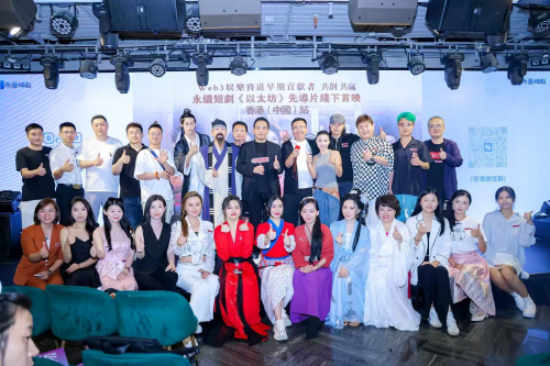 在正剧《以太坊》播出之前,主创团队还播放了业内优秀的作品,尤其是最近备受关注,由Tweinke出品的Web3悬疑短剧《黑琥珀》,K线教主的电影节获奖Web3作品《转世困境》,还有主创团队创作的其他作品,包括2018年轰动全球的热门行为秀《比特币生存挑战》、2024年Web3首部短剧《重生之我再币圈当大佬》。今天与其是娱乐赛道的共创会,更是一场热闹的行业作品的“电影节”。