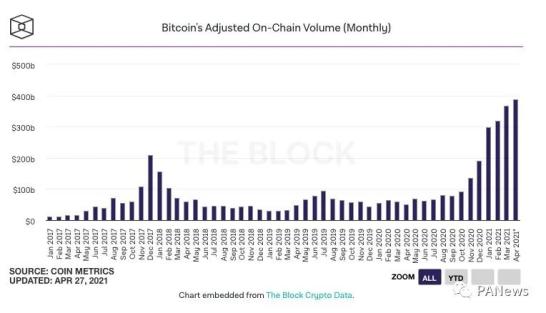 投资者跑步入场使得比特币的交易量不断创历史新高。据The Block Research数据显示,今年3 月份的比特币链上交易量达3662.7亿美元,连续3个月续刷历史新高,环比增加14.7%。同时,比特币矿工收入也大幅增加,3月的比特币矿工总收入达17.5亿美元,其中9.55%来自交易费用。