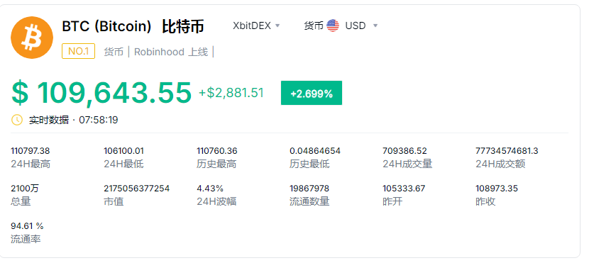 5月22日,比特币价格一度突破11万美元,再创历史新高。截至7时57分,比特币报10.96万美元/枚,日内涨幅2.699%。