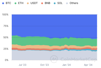 值得注意的是,比特币与加密货币市场的总市值均出现了下跌,然而比特币的市占率却增高了。比特币作为加密货币领域市值最大的标的,其下跌往往有着牵一发而动全身的效果。数据显示,比特币自3月高点以来已下跌超过17%,然而加密货币市场的去中心化金融板块同期跌幅达到了26.9%,游戏板块等小众板块跌幅更大。