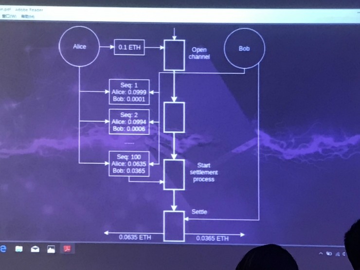 如图所示,即使是交易额很小的一笔交易,也需要另一方的签名来确认完成。在序列号为1的交易中,我们看到“Alice:0.0999 Bob:0.0001”的字样,这代表着什么?代表着:“我 ,Alice,持有着0.0999的以太币,经过签名确认,向持有0.0001的Bob发起交易”。接着,序列号为2的“票据”亦是同理。