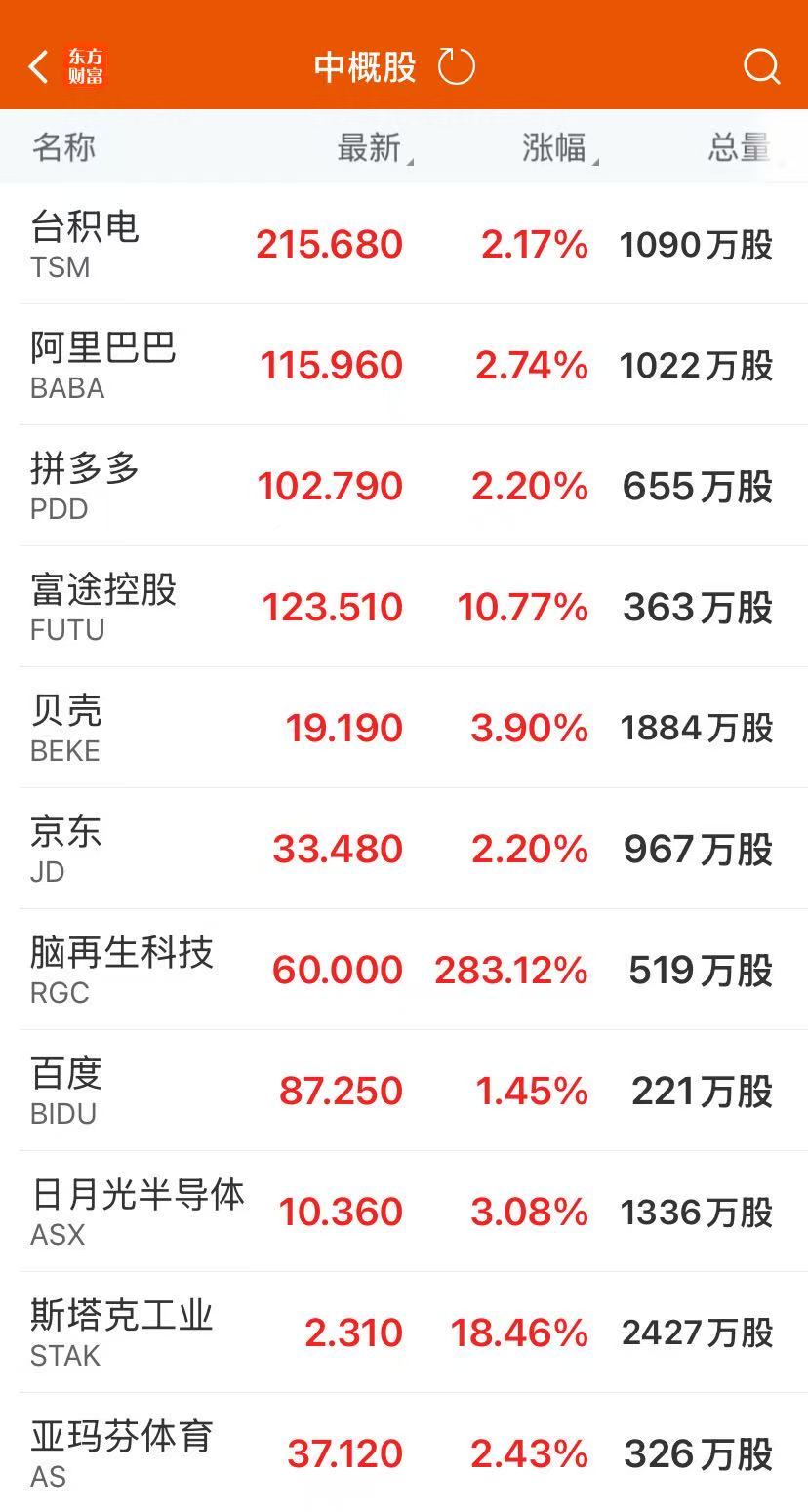 热门中概股多数收涨,纳斯达克中国金龙指数收涨2.07%。富途控股涨超10%,哔哩哔哩涨超5%,阿里巴巴、拼多多、京东均涨超2%。脑再生科技涨超280%。