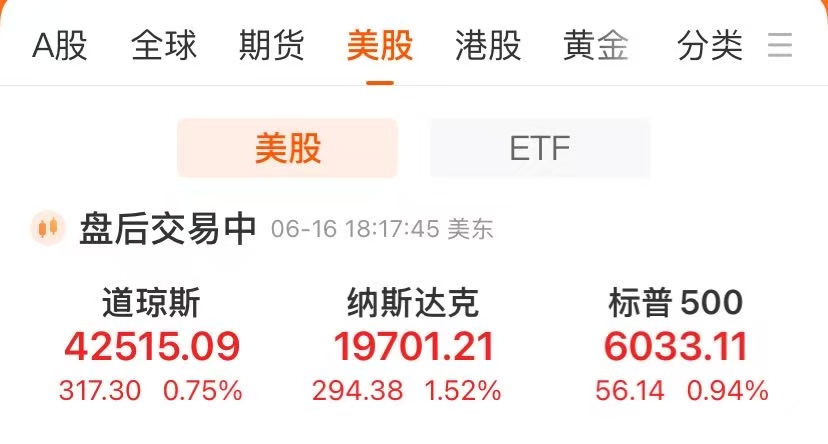 美东时间周一,美股三大指数6月16日收盘全线上涨。截至收盘,道琼斯工业平均指数比前一交易日上涨317.3点,收于42515.09点,涨幅为0.75%;标准普尔500种股票指数上涨56.14点,收于6033.11点,涨幅为0.94%;纳斯达克综合指数上涨294.38点,收于19701.21点,涨幅为1.52%。