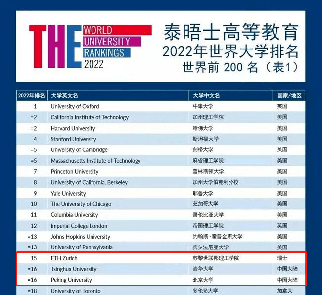 在QS的2022学校排名中,苏黎世联邦理工学院冲入前十,占据了第八名的位置,而在泰晤士的排名中,也拿到了15名的好成绩,刚好,压了国内最好的清华和北大一头。