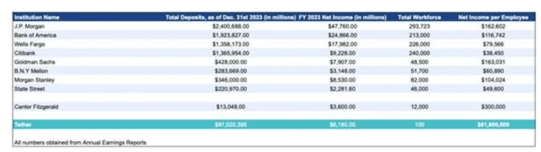 尽管在每一家大型传统银行的高层中,都存在像他们这样具有前瞻意识的人,但整个银行体系这个 “ 有机体 “ 并不愿意发生根本性变革,因为这意味着对其众多 “ 细胞 “(也就是员工)的生存构成威胁。Tether 仅凭不超过 100 人的团队,便能通过区块链技术完成全球银行系统的关键职能,实现高度可扩展性。作为对比,全球公认运营效率最高的商业银行 — — 摩根大通(JP Morgan),目前员工总数超过 30 万人。