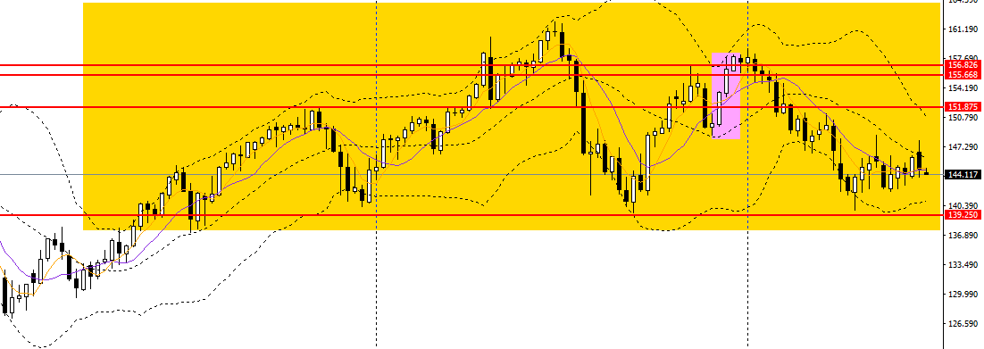 美日上周收长阴线周均线之下,波段预计将维持震荡。周五小幅反弹,今日亚盘重新拐头下行,4小时下探144关口支撑,空单仍可持有,如进一步跌破,可看空至143.7附近。