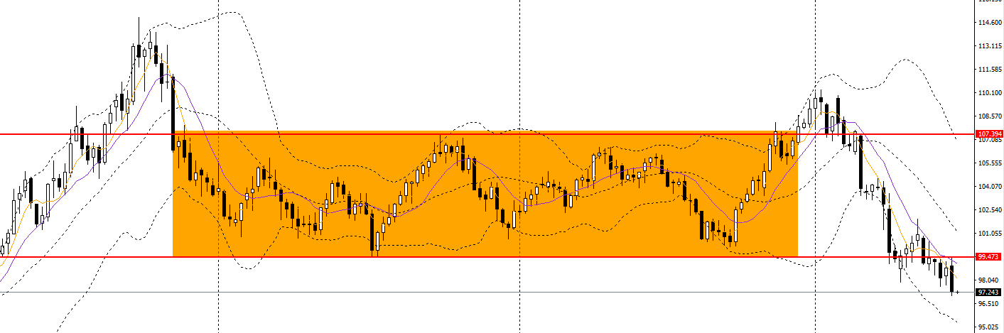 美元指数周线周均线,波段预计将延续震荡走低。周五收十字阴线,仍徘徊于日线布林下轨附近,日线区间内纠结,如无法下破前低,后市有望升破97.6一线阻力。