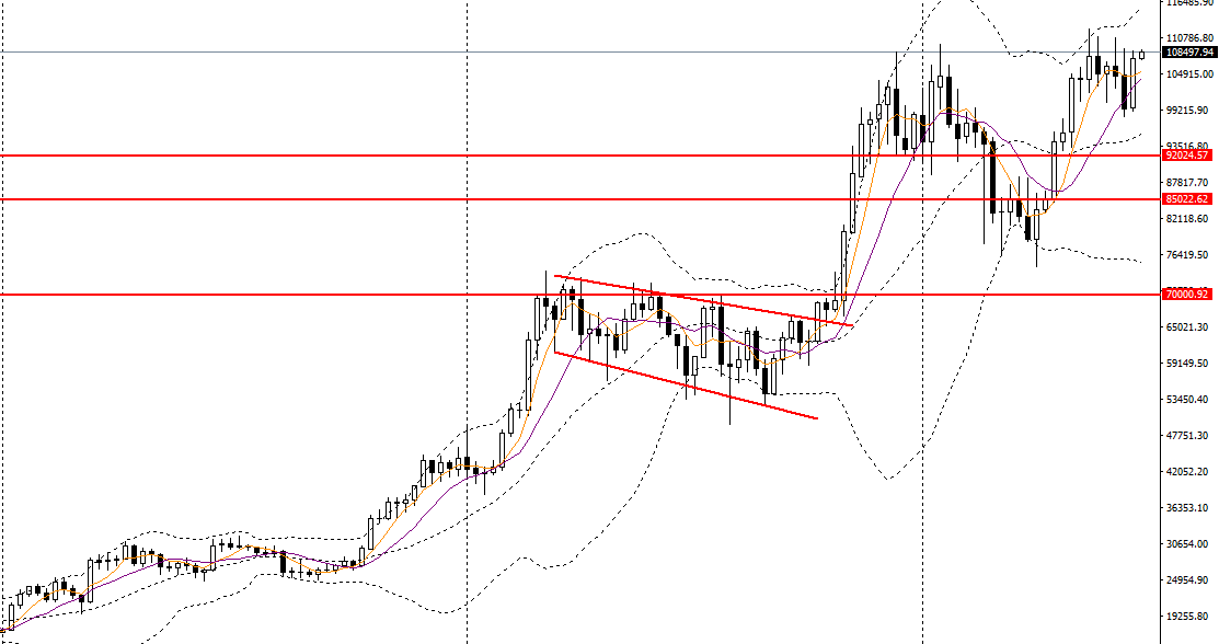 比特币上周强势反弹,站上5周均线,波段有望继续突破前高。昨日收倒锤阳线一线支撑,如立于上方,后市预计将挑战110000。