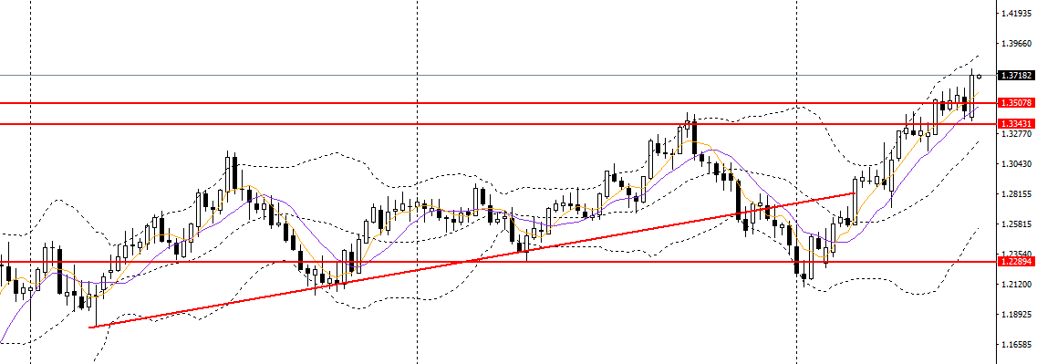 镑美上周一举破高,站上5周均线,RSI到达高位,波段走势依然强劲。周五收十字星,仍徘徊于日线小时多头动能放缓,可暂时观望,如于1.37附近再度企稳可进多。