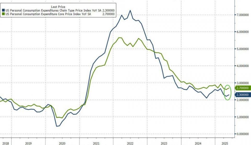 周五,美指于低位震荡。备受美联储青睐的通胀指标——核心个人消费支出(PCE)物价指数5月2.68%,预期 2.6%,前值 2.5%,环比上涨0.2%,表现略超预期;PCE物价指数同比 2.3%,预期 2.3%,前值 2.1%,环比0.1%,均持平预期。许多经济学家预计,随着企业日益将更高的进口guanshui转嫁给家庭,未来几个月通胀将有所回升。与此同时,美国消费者支出出现自年初以来的最大跌幅,这表明川总政府经济政策带来的不确定性正日益拖累经济增长前景。数据公布后,由于两大数据表现不一致,美指先扬后抑,涨幅受限。
