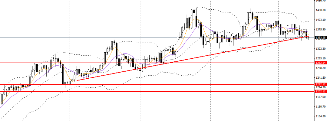 铂金收十字阴线,今日亚盘延续阴跌,日线小时失守上行趋势线附近承压可做空,后市有望回踩1320-1330一带。