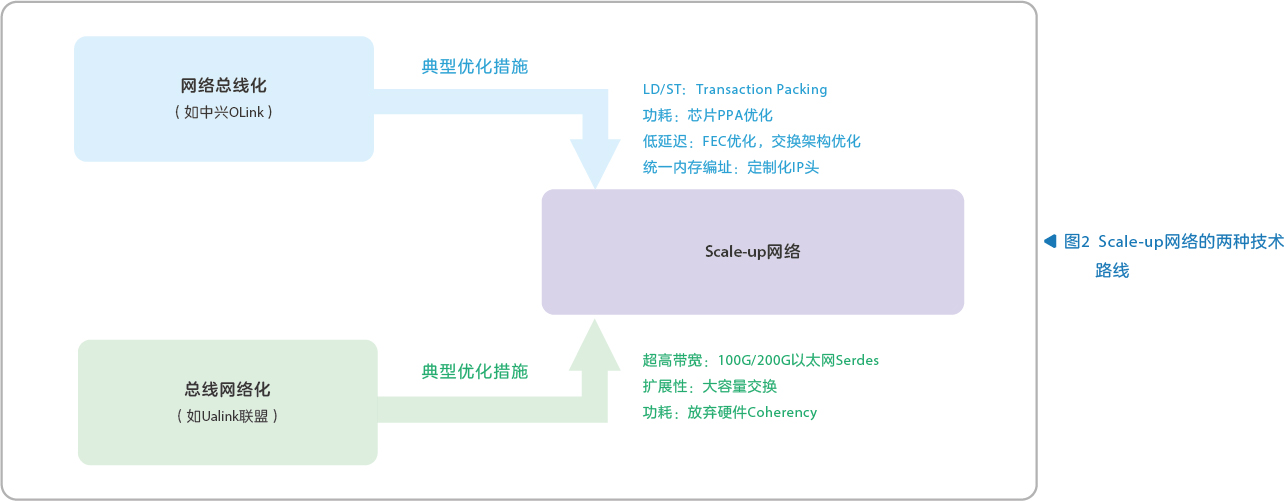 鉴于Scale-up网络对未来AI基础设施的重要性,当前业界存在多种技术路线,大致可以分为“网络总线化”和“总线网络化”两种思路(见图2)。
