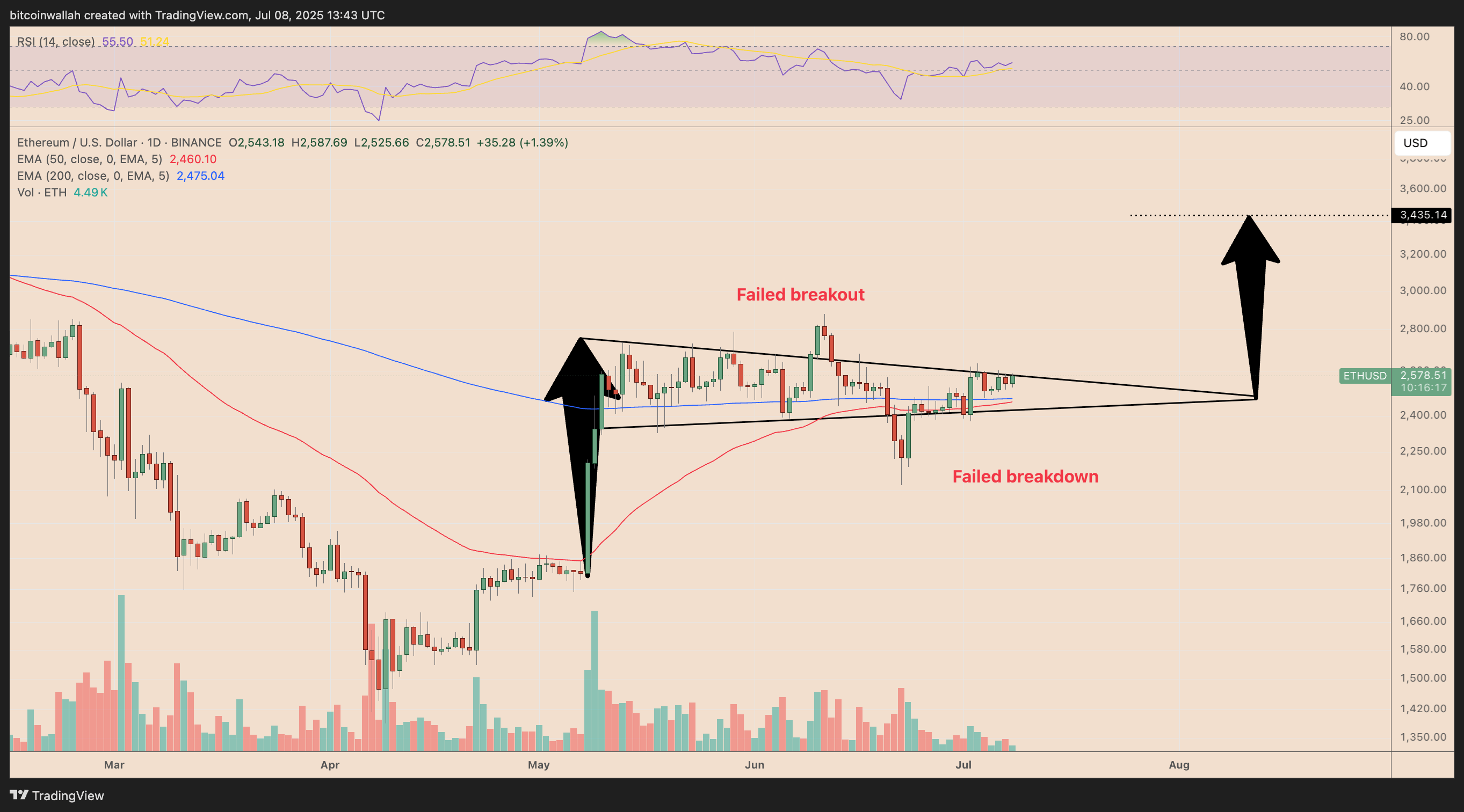 ETH日线图上正处于典型牛旗形态,该形态通常预示行情将延续,价格多以突破前期趋势方向收尾。