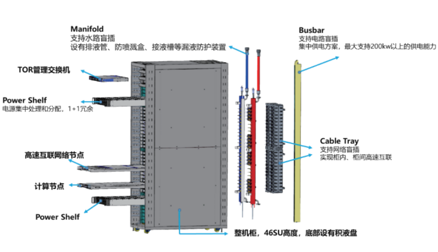 新华三液冷整机柜创新性地实现了水、电、网三总线“盲插”:水路方面,服务器节点的冷板进出水管路通过UQDB型快接头与机柜内Manifold实现可靠盲插连接;电路方面,供电系统采用集成铜排(Busbar)设计,接触界面遵循ORV3 Busbar规范,服务器节点通过盲插方式直接与机柜Busbar连接取电;网络方面,通过高速铜缆组成的CableTray实现芯片、节点间的互联,彻底免除了传统跳线步骤,从而实现快速部署。液冷整机柜的盲插设计通过简化架构降低了系统故障点,操作人员只需将服务器节点平稳推入机柜指定位置,水路、电路和网络的连接即可自动、精准地一次完成,这极大地简化了整个安装和维护流程,有效减少了维护所需的时间和工作量。随着算力中心向自动化、智能化方向转型,盲插设计更契合未来的发展方向。