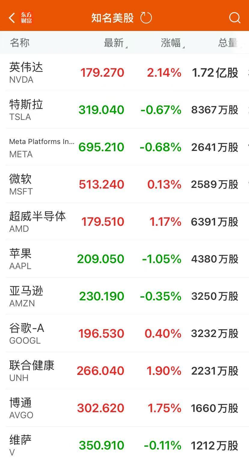 盘面上,大型科技股多数收跌,英伟达涨2.13%,谷歌涨0.40%,微软涨0.13%,亚马逊跌0.37%,特斯拉跌0.65%,脸书跌0.67%,苹果跌1.07%。