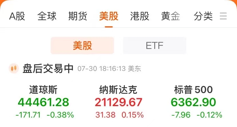 7月30日美股收盘涨跌不一,道指跌0.38%,纳指涨0.15%,标普500指数跌0.12%。美联储维持基准利率不变,符合预期,但两位理事反对降息,为30多年来首次。鲍威尔表示9月是否降息尚未决定,将参考经济信息。黄金、铜期货价格下跌,国际油价站上70美元。欧洲主要股指小幅上涨。热门中概股多数下跌。特朗普呼吁降息,但鲍威尔未给出明确信号。