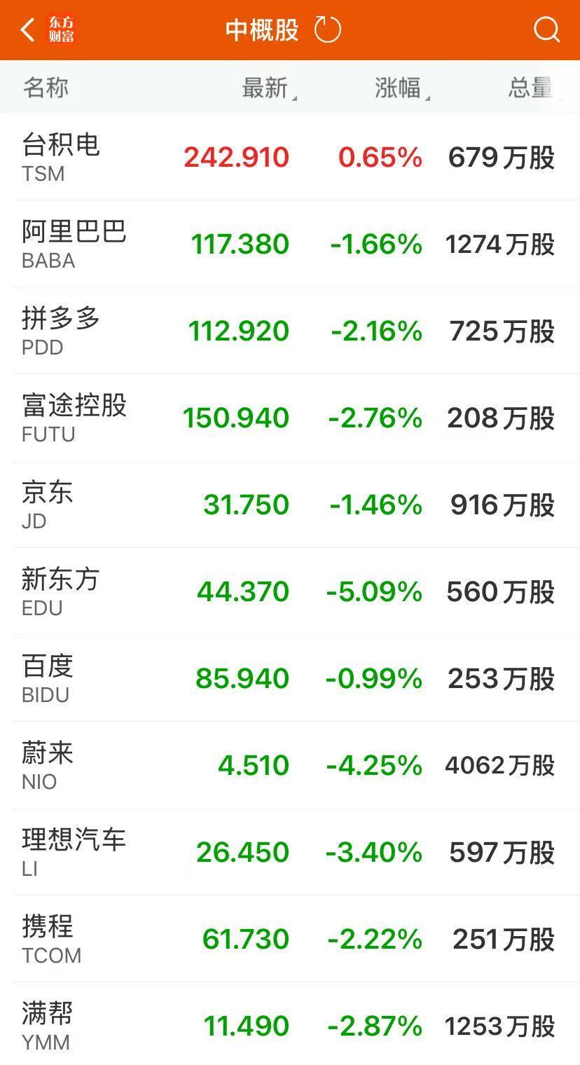 纳斯达克中国金龙指数跌1.82%。热门中概股方面,亚玛芬体育涨1.33%,哔哩哔哩跌0.74%,网易跌0.92%,百度集团跌0.99%,好未来跌1.03%,京东集团跌1.44%,华住集团跌1.62%,阿里巴巴跌1.69%,贝壳跌1.87%,百济神州跌1.89%,小鹏汽车跌1.96%,拼多多跌2.16%。