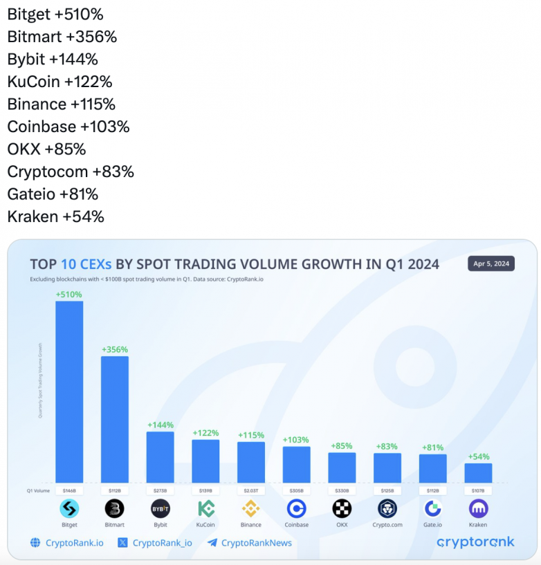 2024年Q1,Bitget再次交出一份令人满意的答卷。根据CryptoRank数据显示,Bitget是Q1 CEX中拥有最高的现货交易量增长的平台。在牛市初期的当口,CEX格局洗牌,大家的相互角力只存在于用户所获得的财富效应与口碑中,新一轮周期将开启,平台与用户注定互相成全。