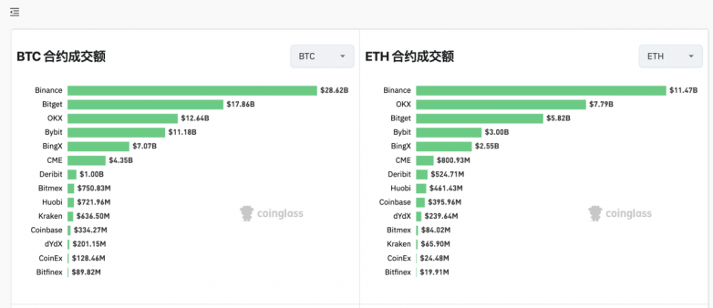 据coinglass数据显示,BTC 24小时合约交易额前三名的中心化交易平台分别为币安、Bitget、OKX,其中币安 BTC 24小时交易额为286.2亿美元、Bitget为178.6亿美元、OKX为126.4亿美元。以太坊合约交易额方面,Bitget 24小时合约交易额达58.2亿美元,位列第三,前两名分别为币安和OKX。