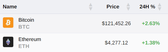 截至下午5:30左右,比特币的价格为121452美元,上涨了2.63%。与此同时,其他加密货币价格也出现大幅度的上涨,如以太坊价格上涨了1.38%。