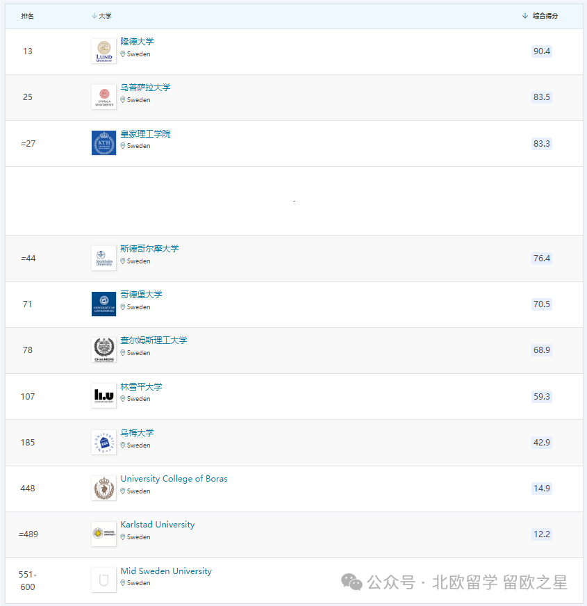 瑞典11所大学上榜,6所大学欧洲排名前100,分别是隆德大学欧洲排名第13位、乌普萨拉大学欧洲排名第25位、皇家理工学院欧洲排名第27位、斯德哥尔摩大学欧洲排名第44位、哥德堡大学欧洲排名第71位、查尔姆斯理工大学欧洲排名第78位。
