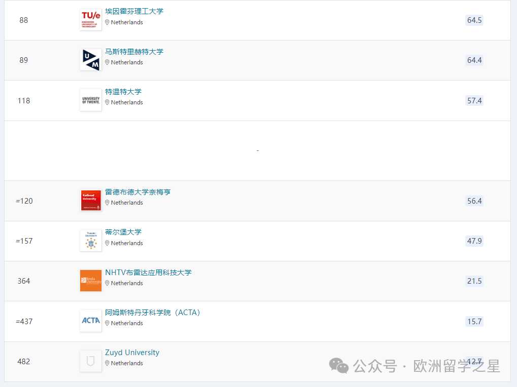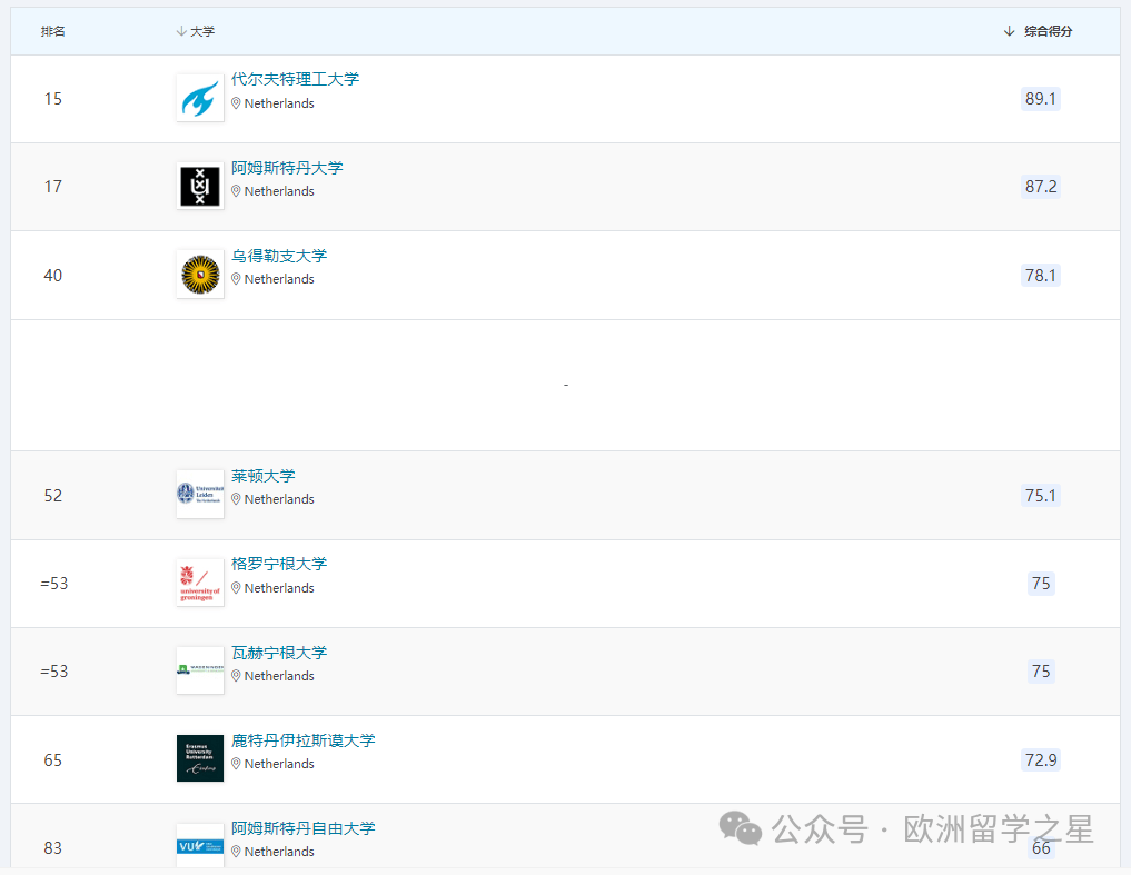 荷兰16所大学上榜,10所大学欧洲排名前100,分别是代尔夫特理工大学欧洲排名第15位、阿姆斯特丹大学欧洲排名第17位、乌特勒支大学欧洲排名第40位、莱顿大学欧洲排名第52位、格罗宁根大学欧洲排名第53位、瓦格宁根大学欧洲排名并列第53位、鹿特丹伊拉斯姆斯大学欧洲排名第65位、阿姆斯特丹自由大学欧洲排名第83位、埃因霍温理工大学欧洲排名第88位、马斯特里赫特大学欧洲排名第89位。