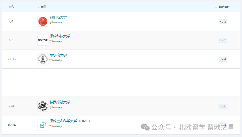 挪威5所大学上榜,2所大学欧洲排名前100,分别是奥斯陆大学欧洲排名第64位、挪威科技大学欧洲排名第95位。