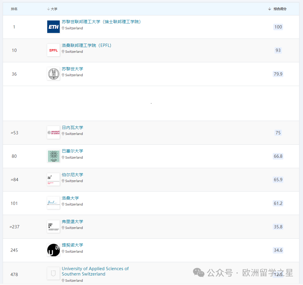 在瑞士上榜的10所大学中,有6所进入前100,包括欧洲排名第一和第十的高校。