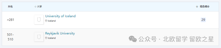 冰岛两所大学上榜,没有大学欧洲排名前100,上榜的两所大学分别是冰岛大学欧洲排名并且第281、雷克雅未克大学欧洲排名第501-510。
