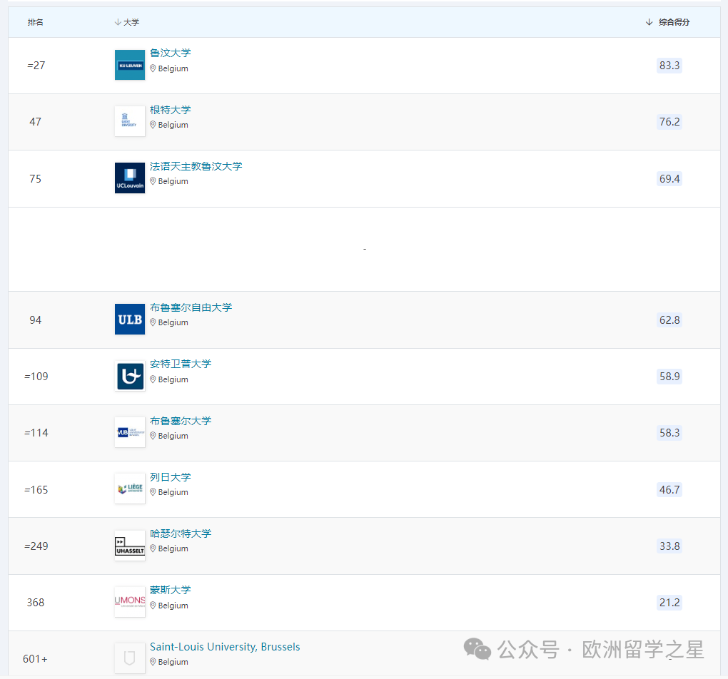 比利时10所大学上榜,4所大学欧洲排名前100,分别是荷兰语鲁汶大学欧洲排名并列第27、根特大学欧洲排名第47、法语鲁汶大学欧洲排名第75、法语布鲁塞尔自由大学欧洲排名第94。