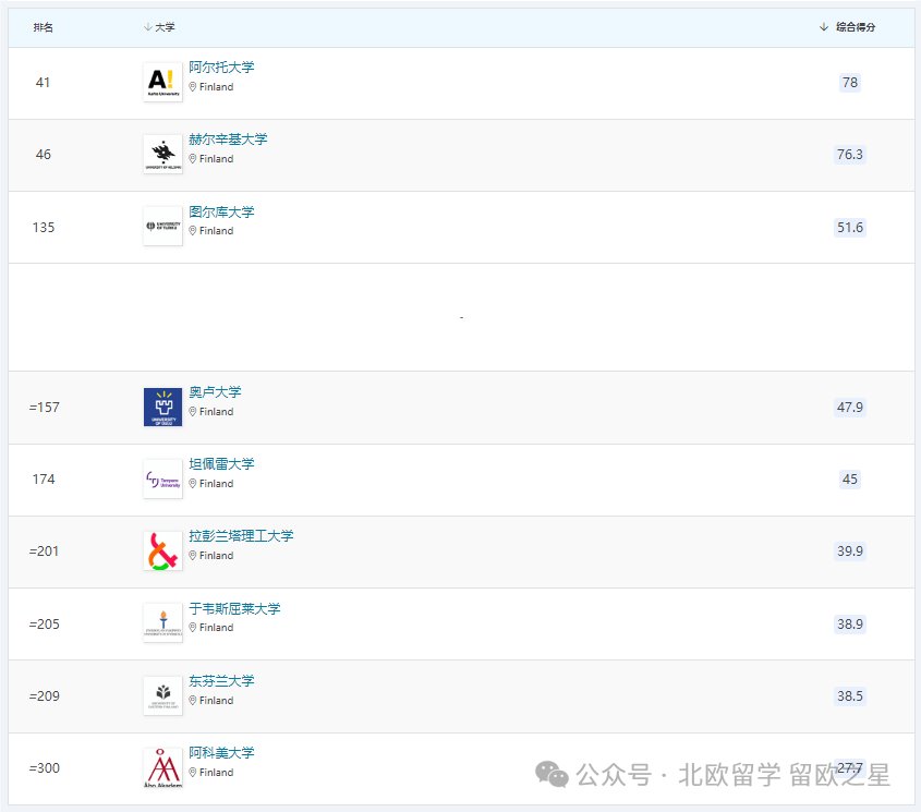 芬兰9所大学上榜,2所大学欧洲排名前100,分别是阿尔托大学欧洲排名第41位、赫尔辛基大学欧洲排名第46位。