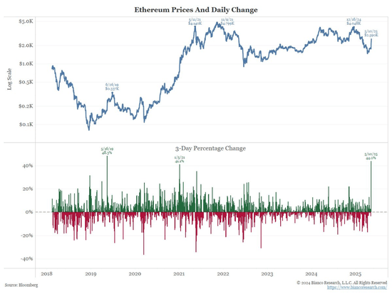 短短72小时内,ETH价格飙升超过40%,触及2600美元关口,创下自2019年(当时价格不足200美元)以来最佳三日涨幅表现,显著跑赢比特币等其他大型数字货币资产。