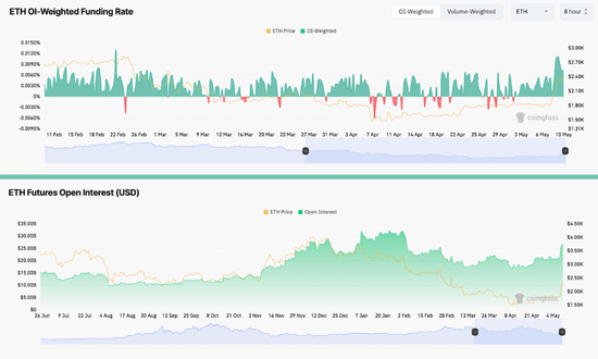 与此同时,以太坊未平仓合约总价值从5月8日的212.8亿美元激增至5月10日的267.7亿美元,以太坊永续期货的每周融资利率也从0.10%上升至0.15%。