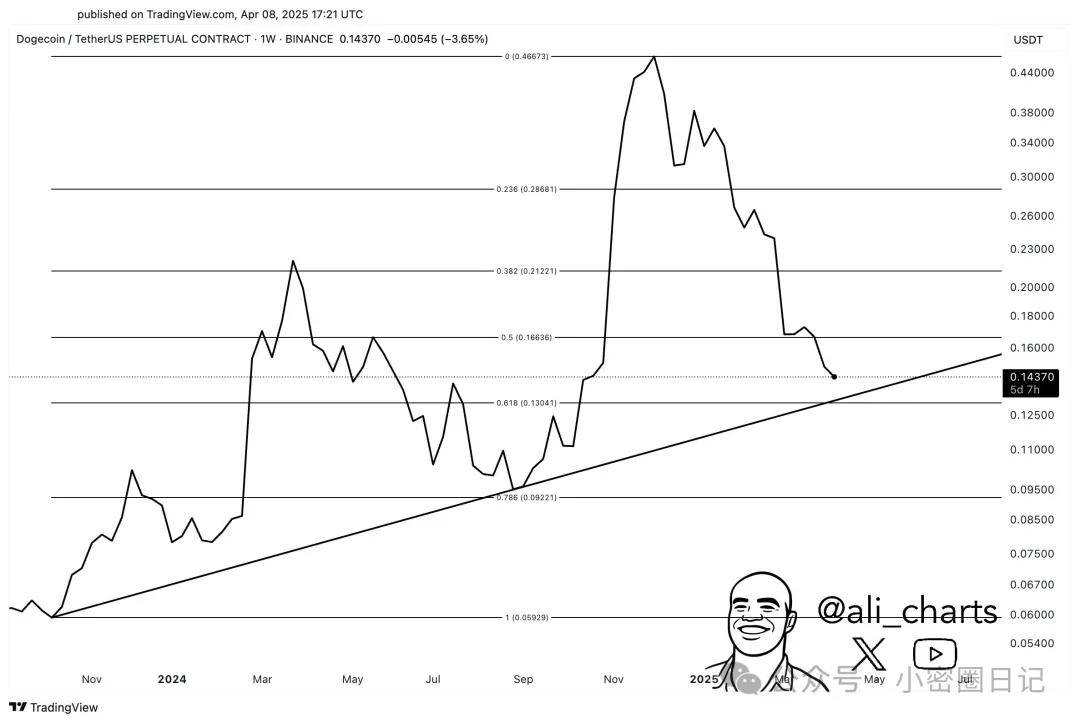 与此同时,阿里·马丁内斯(Ali Martinez)还指出了狗狗币(DOGE)价格的关键支撑位,投资者应密切关注。马丁内斯指出,自2023年10月以来,这枚领先的表情包币一直遵循上升趋势线美元)汇合。技术指标的这种汇合使得0.13美元成为一个值得关注的关键价格水平,因为它可能决定狗狗币的短期走势。