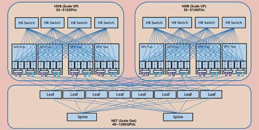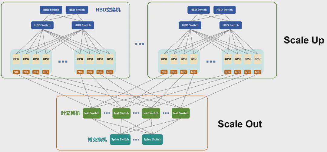 2022年,英伟达通过独立部署NVLink交换机,将互连范围从单机扩展至多机系统,形成高带宽域(HBD)架构。这种支持16卡以上GPU集群、具备超万卡级互连带宽的纵向扩展系统,即构成超节点的核心形态。