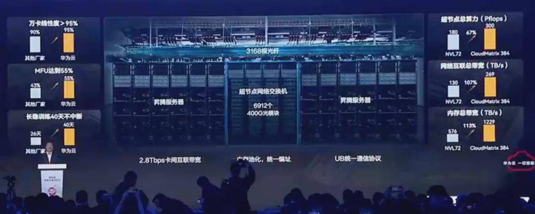 以384张昇腾算力卡组成一个超节点,在目前已商用的超节点中单体规模最大,可提供高达300 PFLOPs的密集BF16算力,接近达到英伟达GB200 NVL72系统的两倍。