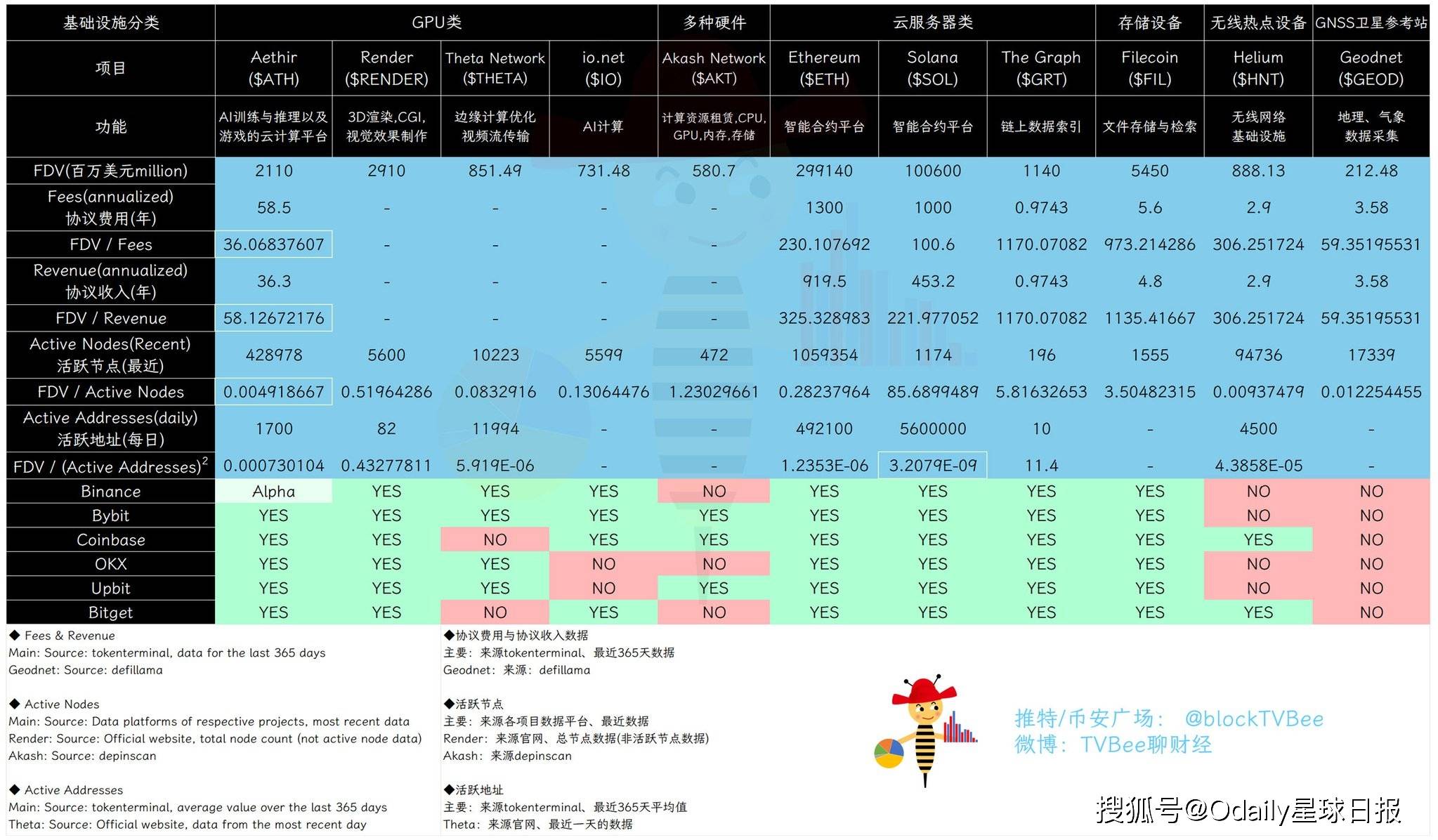 经过对比发现 Aethir 的 FDV/Fees、FDV/Revenue 比值均是最低的,这说明 Aethir 相对于表中的这些项目,可能是最被低估的。