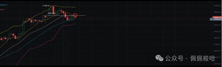 近期比特币回踩30日均线k支撑后,突然发力上攻106k,目前回落至105.3k附近。当前价格受阻于前期支撑转阻力的位置,约为106,000美元,叠加日线日均线压制及布林带中轨阻力,形成多重压制区。